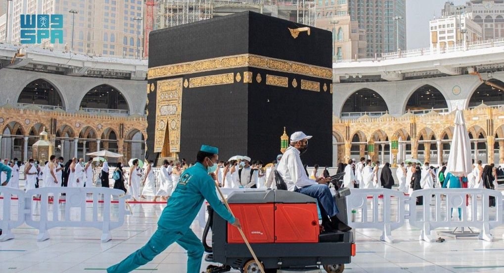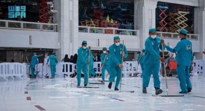تقوم الرئاسة العامة لشؤون المسجد الحرام والمسجد النبوي بتكثيف أعمال تعقيم وتطهير البيت العتيق وسطحه وساحاته ومرافقه وتهيئته للزوار والمصلين (10) مرات يوميًا، بمنظومة عمل يقوم بها (4000) عامل وعاملة على مدار الساعة، تم تأهيلهم وتدريبهم للقيام بأعمال الغسيل كفرق عمل، وفق نظام دقيق يراعي كثافة الأعداد واختلاف الثقافات وشرف المكان والزمان.